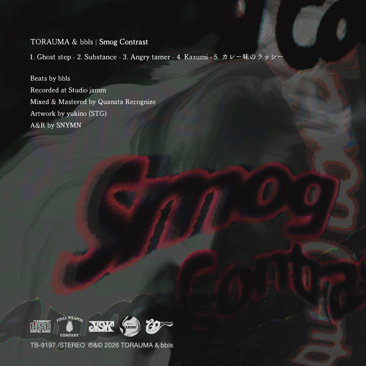タイトルの『Smog Contrast』は、作品中に見られる抽象的な対比や空気感から着想を得て、制作期間中のドライブスルーでの何気ない会話をきっかけに自然と決まったものである。